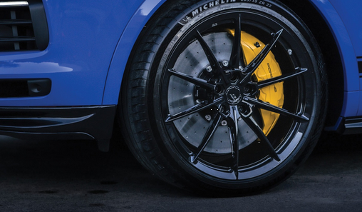 车型:保时捷Cayence 碟盘:440mm碳陶碟。保时捷卡宴是一款SUV车型。保时捷卡宴插电式混合动力现车Cayenne S E-Hybrid配备了绿色的刹车卡钳,并配备了265/50 R19的米其林Michelin Latitude Sport低滚动阻力轮胎。在外观上,cayenne 的前灯和散热片保持了保时捷传统的风格,车宽1940mm,但高度只有1690mm。离地高为273mm,最大斜度角为32度,减震弹簧的行程很长,提高了越野性能,空气减震器具有116mm的调整区域,并可六段调整高低,范围涵盖越野车和跑车的需要,这是保时捷越野车非常独到之处。